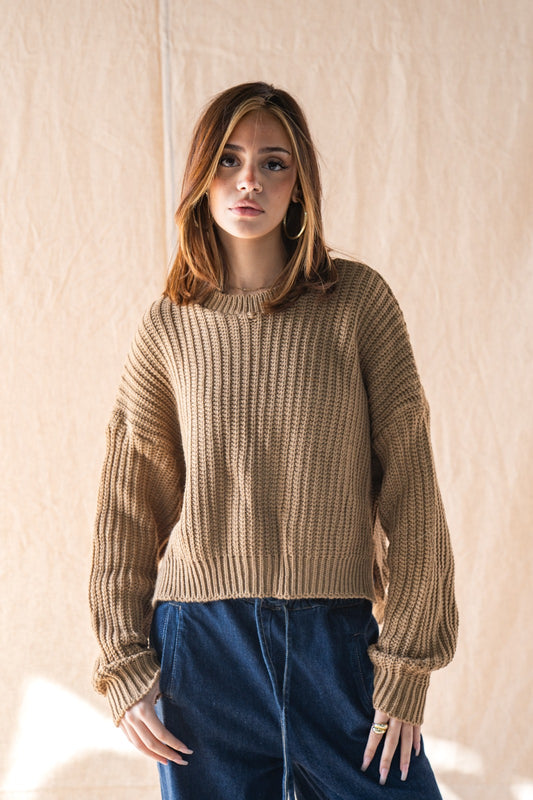 Knitted Cropped Sweater In Camel