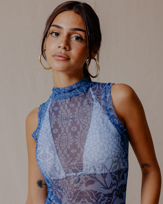Floral Fusion Mesh Top Blue