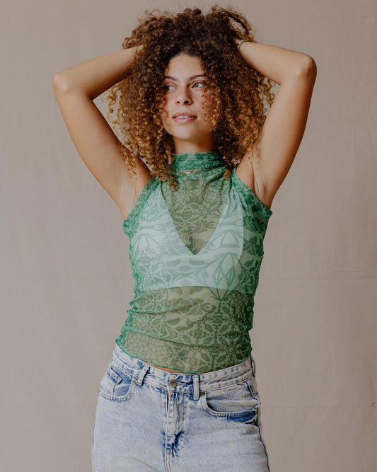 Floral Fusion Mesh Top Green