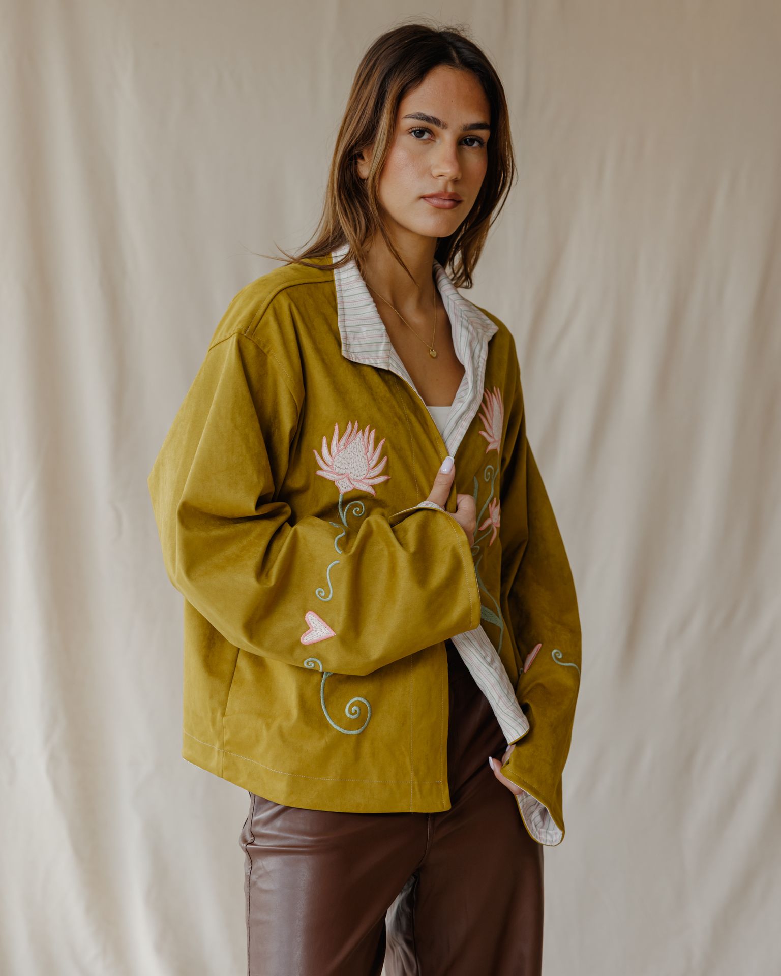 A soft suede-feel jacket featuring delicate floral embroidery and flowing details. Lightweight, feminine, and effortlessly stylish adds a warm, boho touch or a bold, eye-catching layer to any outfit.