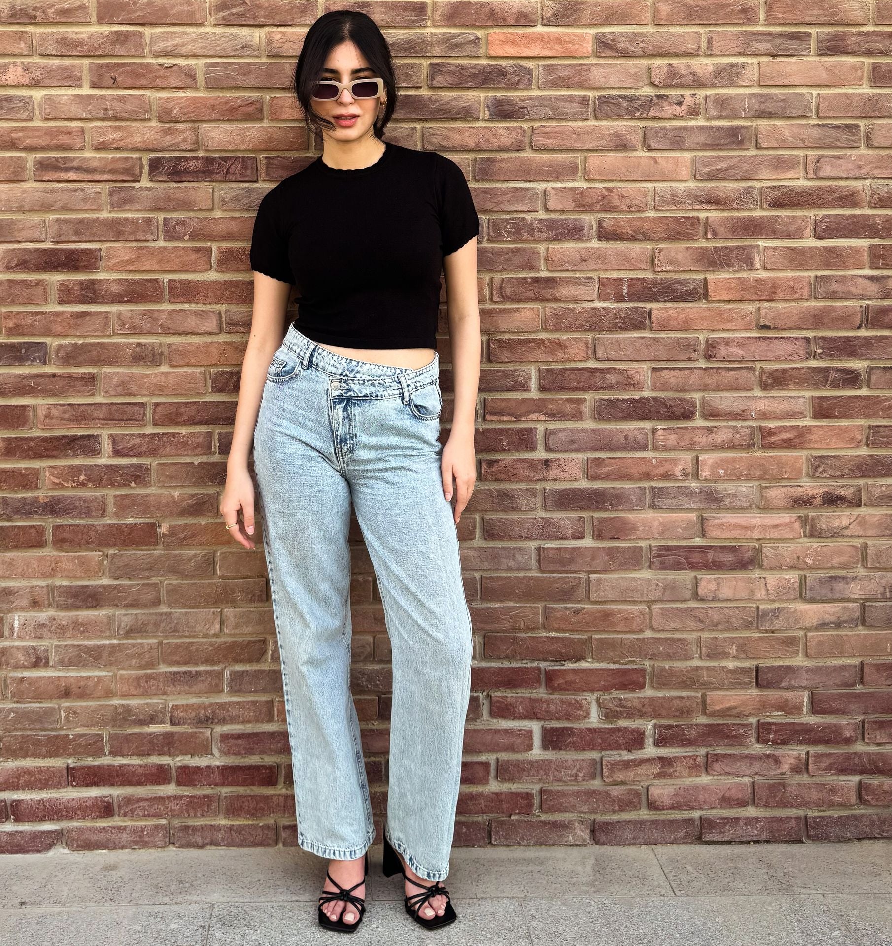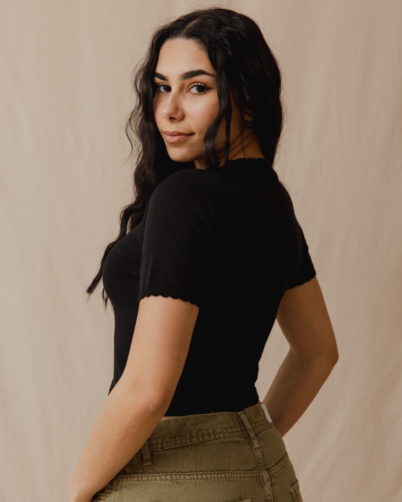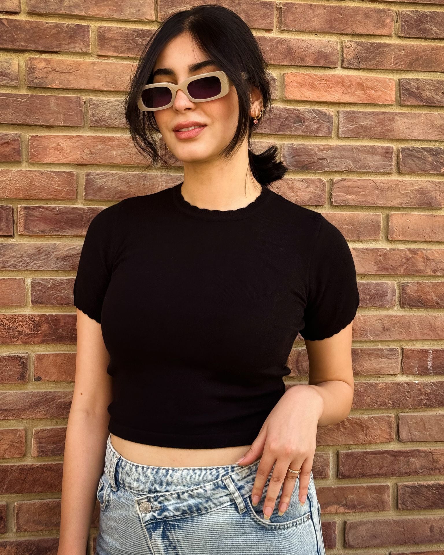 Este cómodo top corto de punto con mangas cortas es un básico imprescindible. Llévalo con otras prendas o solo para un look informal y desenfadado.