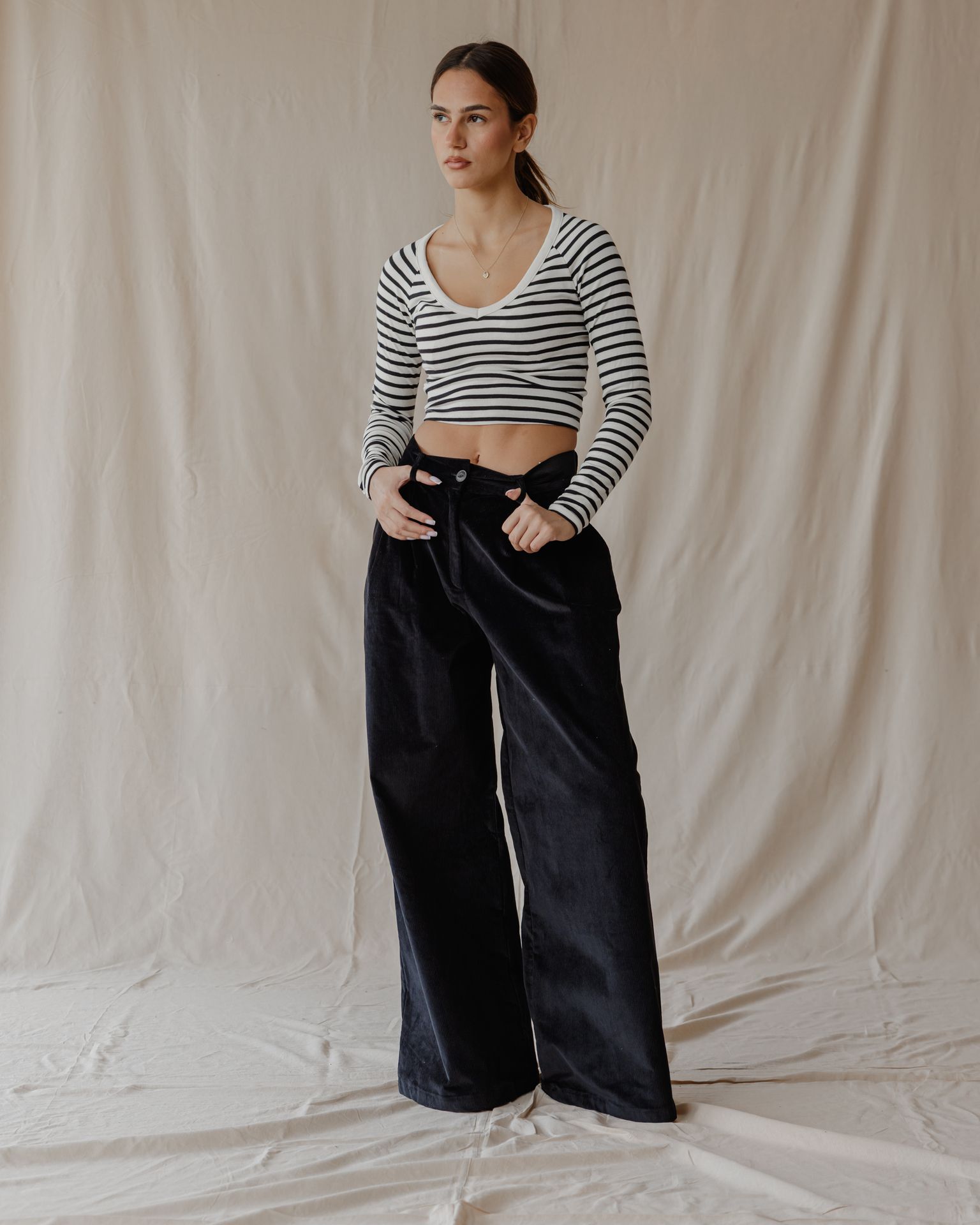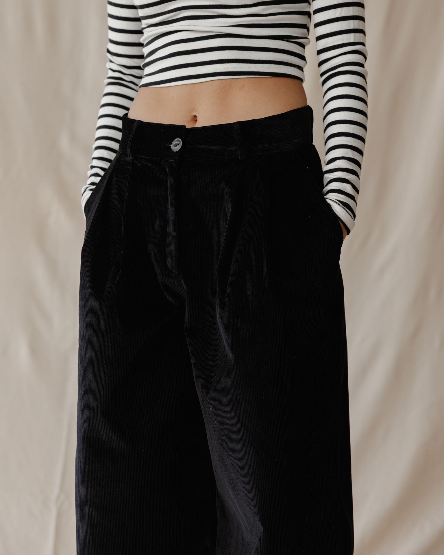 Relaxed, high-waisted corduroy pants with soft drape and wide legs. Finished with front pleats and side pockets, they sit comfortably at the waist and fall straight for an easy, elongated look, perfect with a shirt and boots or a cozy knit.