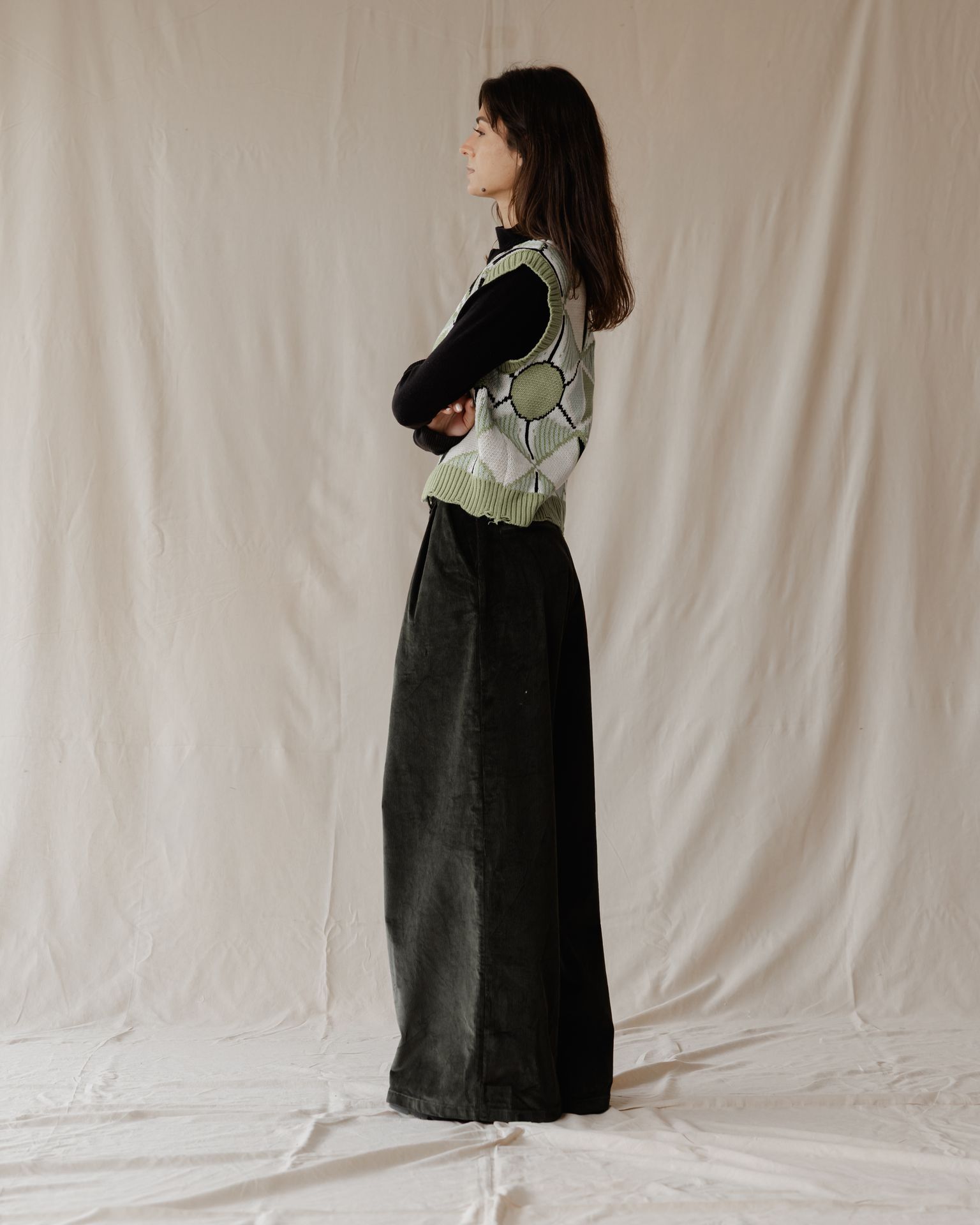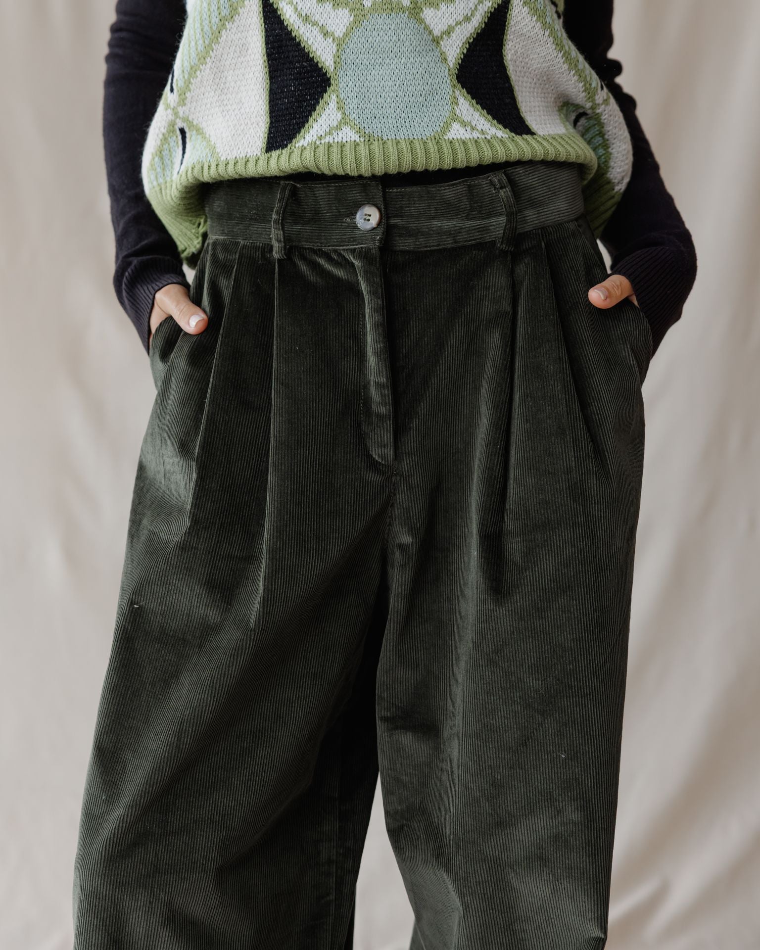 Relaxed, high-waisted corduroy pants with soft drape and wide legs. Finished with front pleats and side pockets, they sit comfortably at the waist and fall straight for an easy, elongated look, perfect with a shirt and boots or a cozy knit.