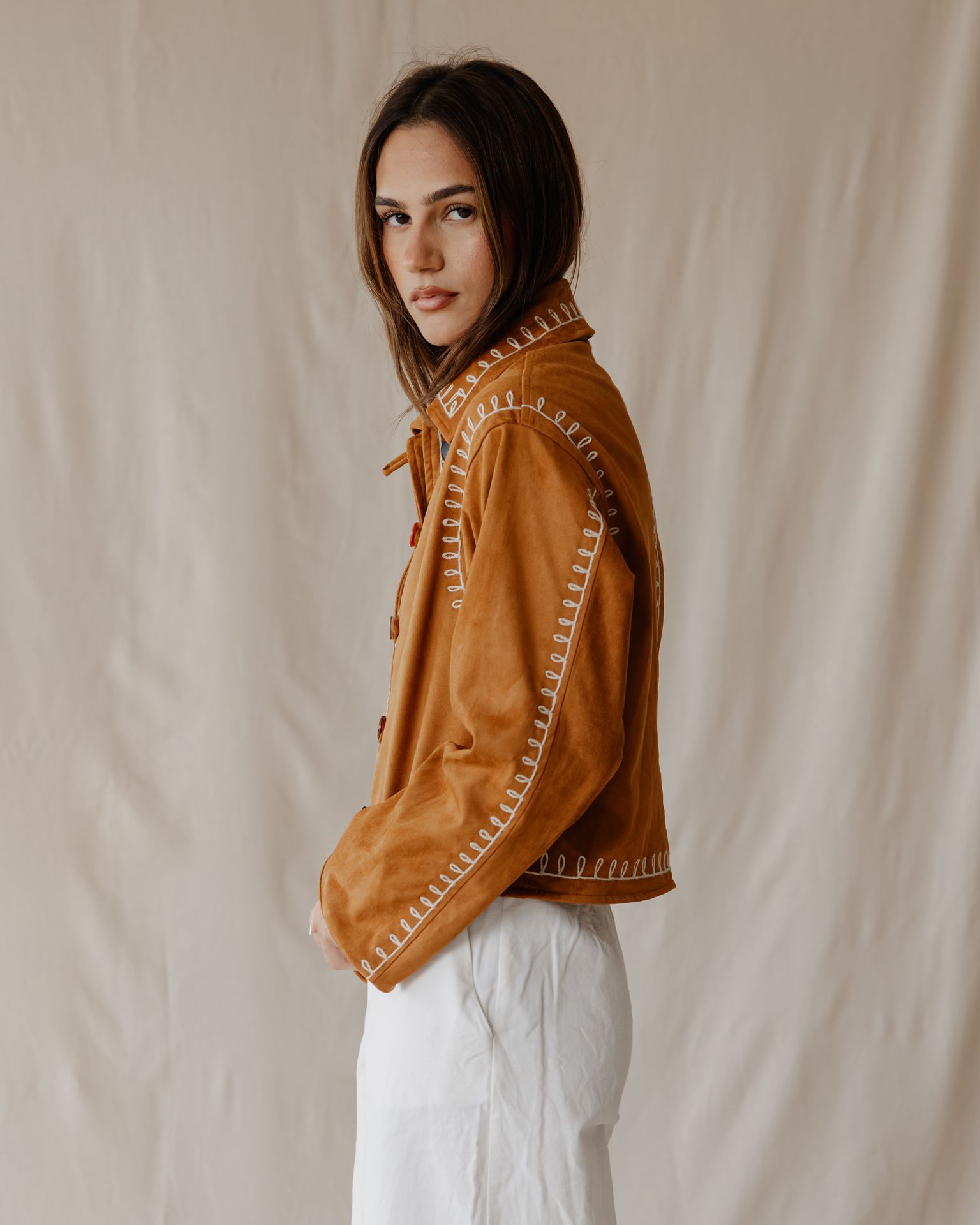 A soft suede-feel jacket featuring hand-stitched loop embroidery along the seams, collar, sleeves, and hem. Designed with a relaxed fit and slightly flared sleeves, it offers an artisanal, vintage-inspired look. The front is finished with standout mixed buttons, adding a unique, crafted touch to the minimalist silhouette.