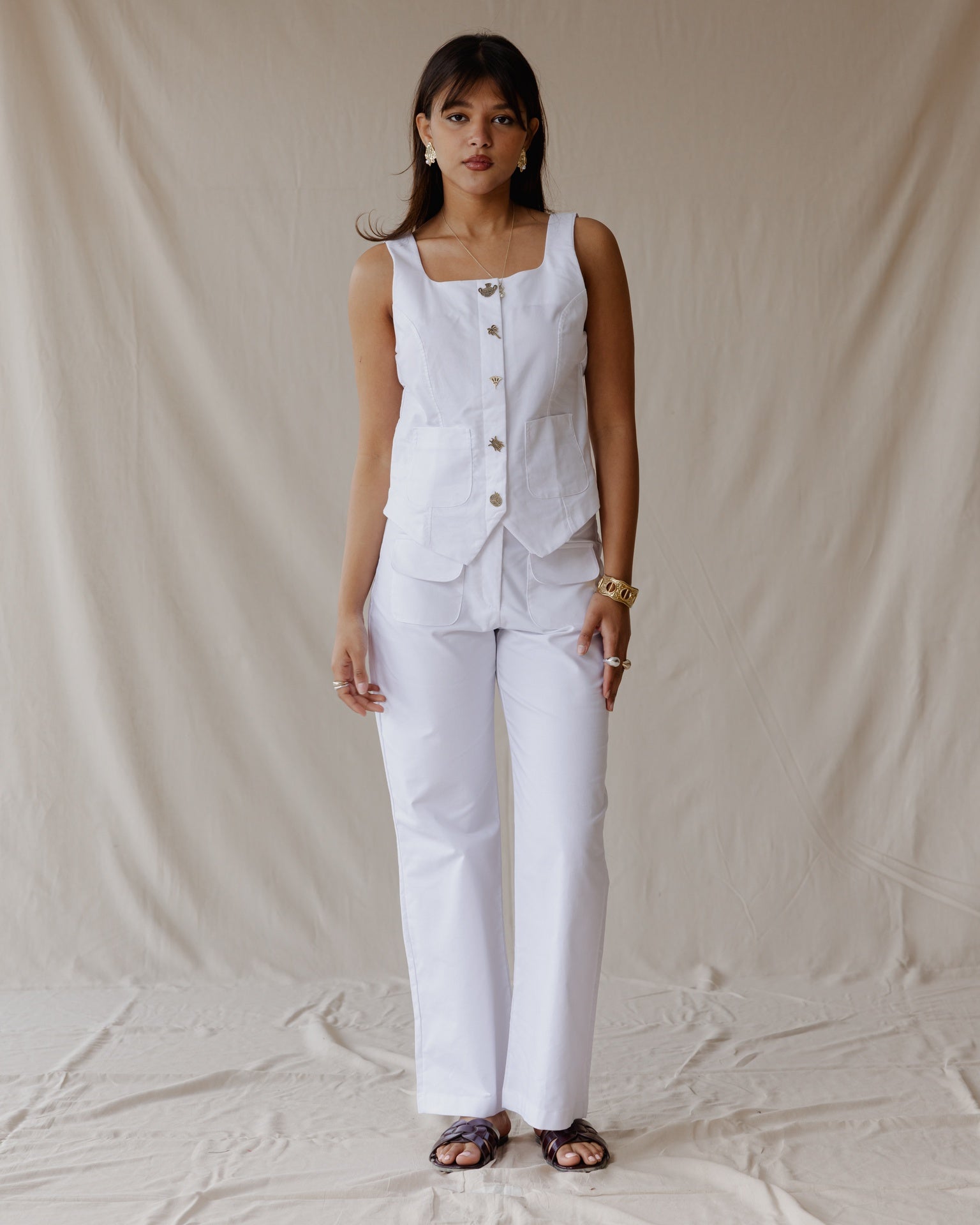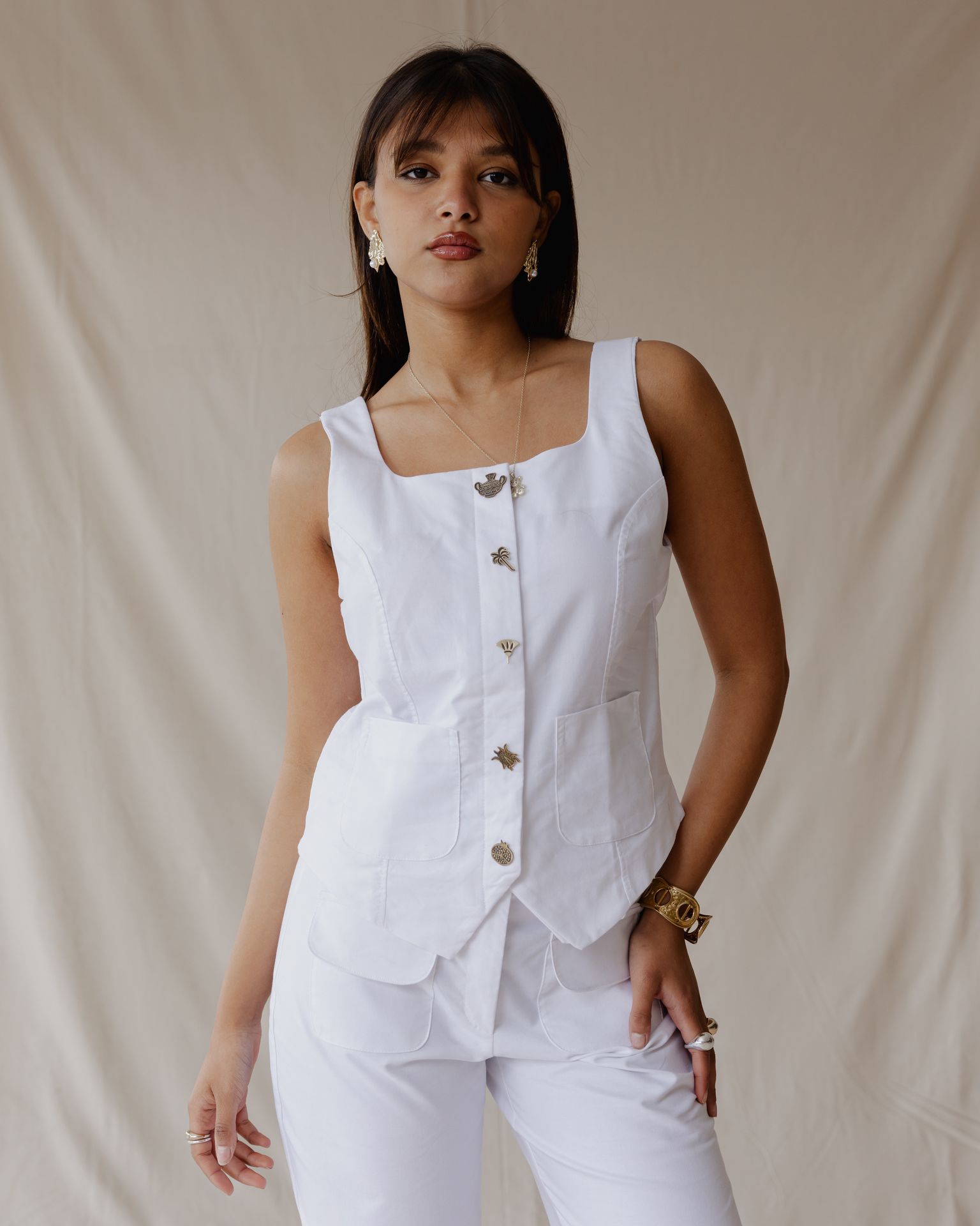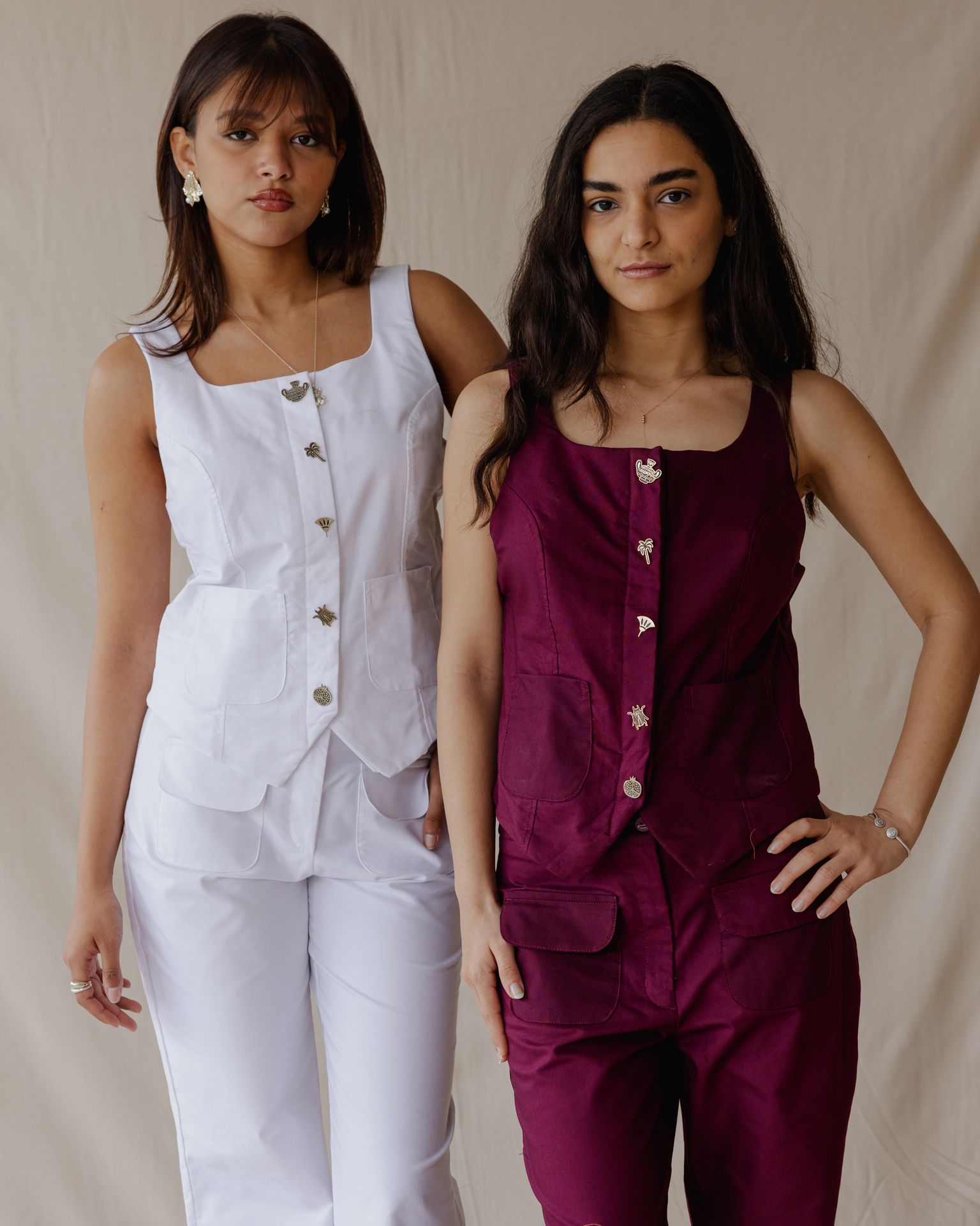 Questo completo in cotone a due pezzi è composto da un gilet sartoriale e pantaloni dalla vestibilità comoda con tasche anteriori. Il gilet è dotato di bottoni nascosti per una funzionalità impeccabile e di bottoni in rame staccabili che si agganciano come orecchini: personalizzalo a piacere senza compromettere la chiusura. Facile da indossare insieme o separatamente, è un capo versatile e indispensabile per la quotidianità.