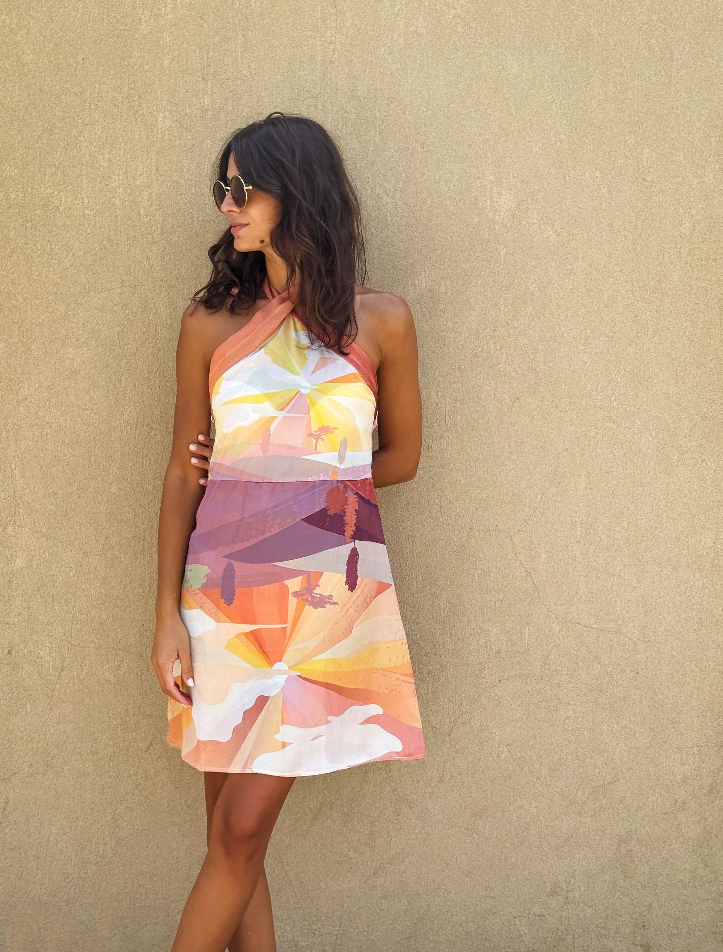 Nostro Mini abito stampato con scollo all'americana è un capo perfetto per una giornata di sole. Questo abito leggero e setoso presenta un'esclusiva stampa astratta e una scollatura a V che si annoda sulla schiena.