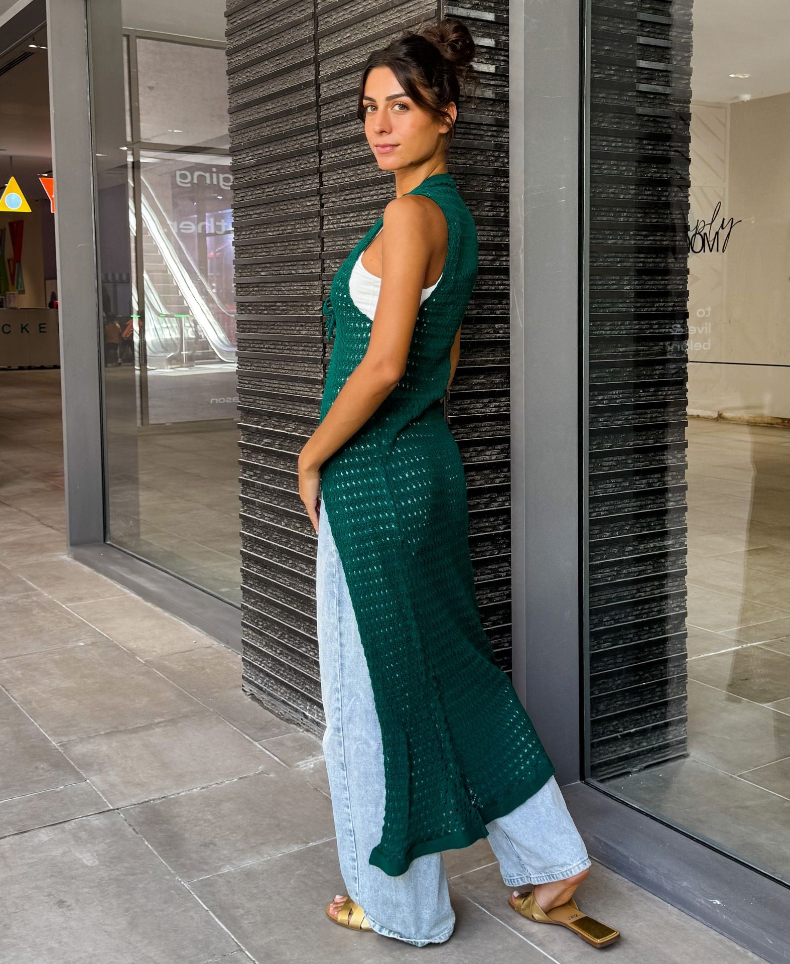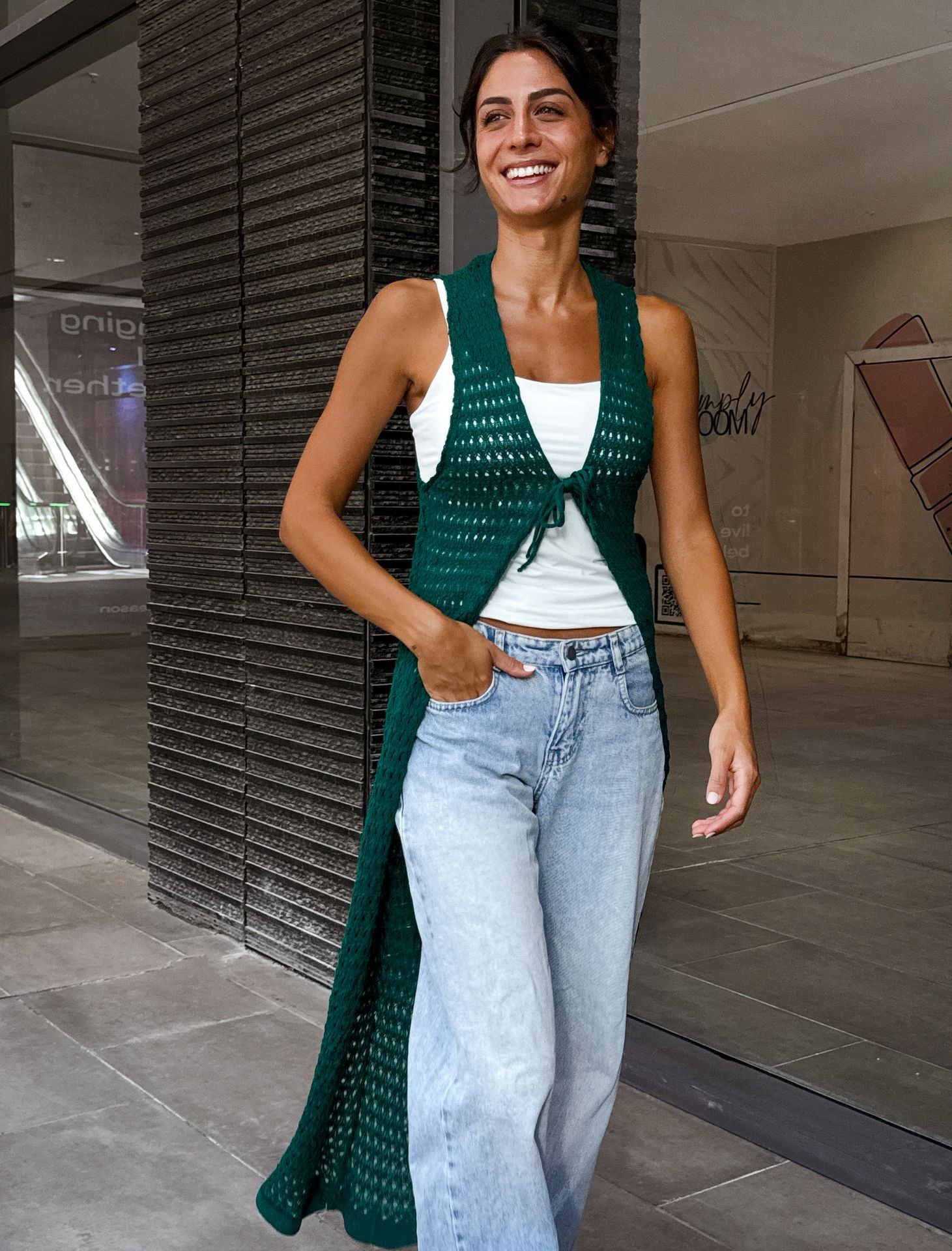 Nostro Cardigan lungo lavorato a maglia è un capo semplice che aggiunge un tocco bohémien chic a qualsiasi look. Questo modello leggero e lavorato a maglia è perfetto da indossare con il tuo top preferito e i tuoi jeans per un look rilassato ma elegante.