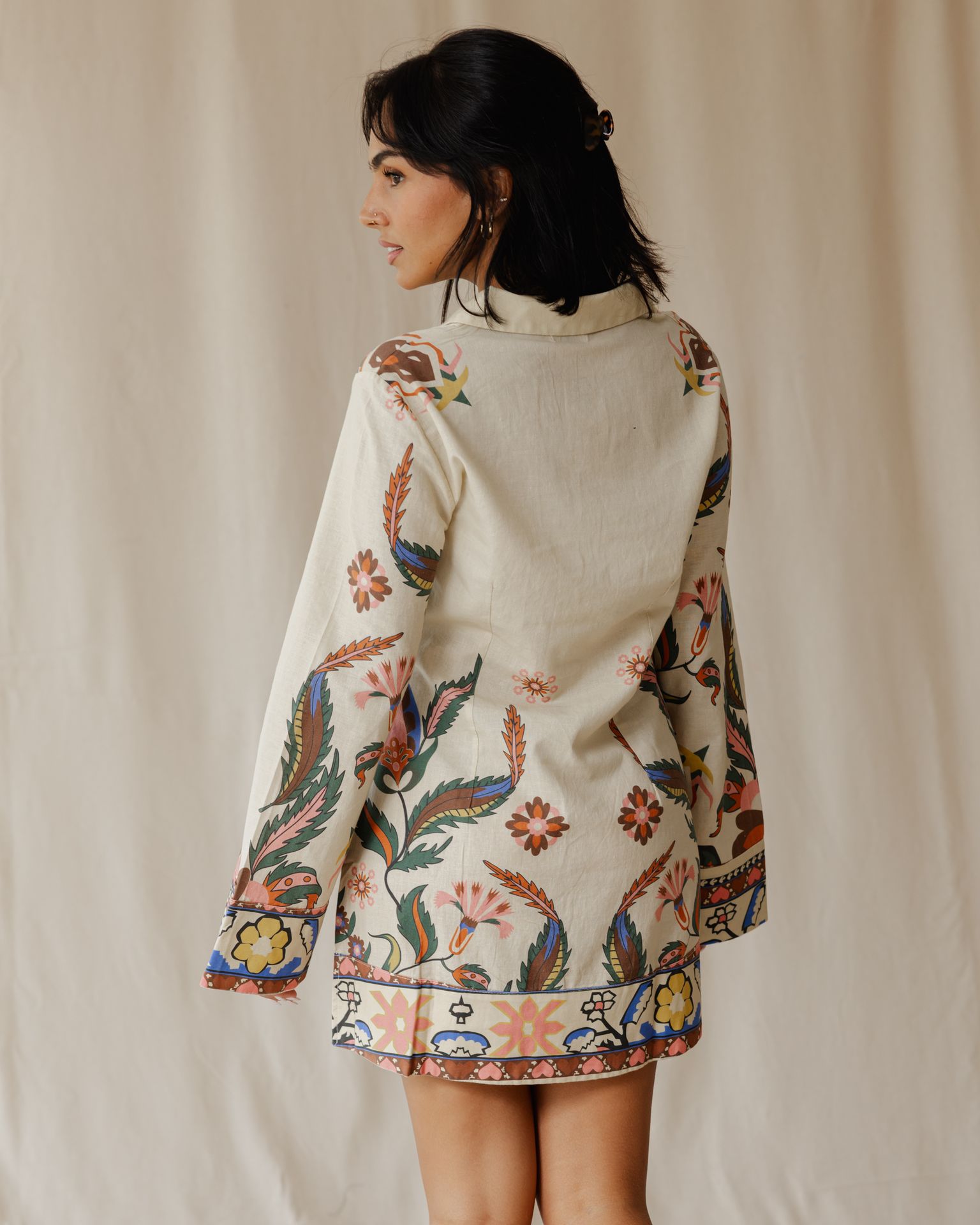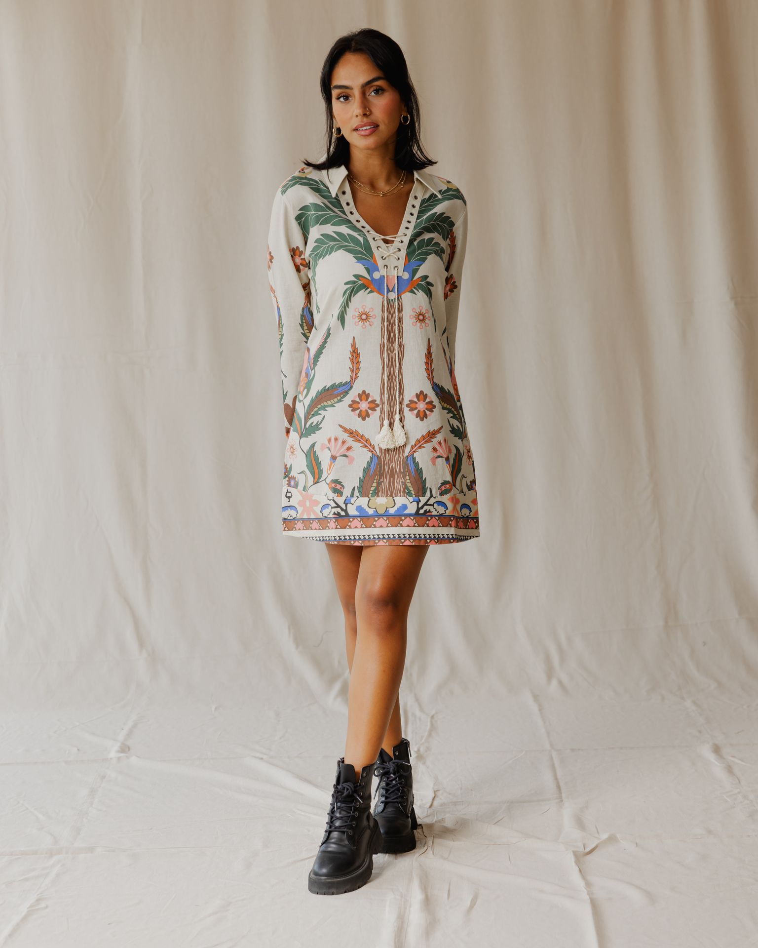 Un miniabito arioso con stampe floreali colorate, maniche lunghe e scollatura con lacci. Perfetto per un look rilassato ma elegante.