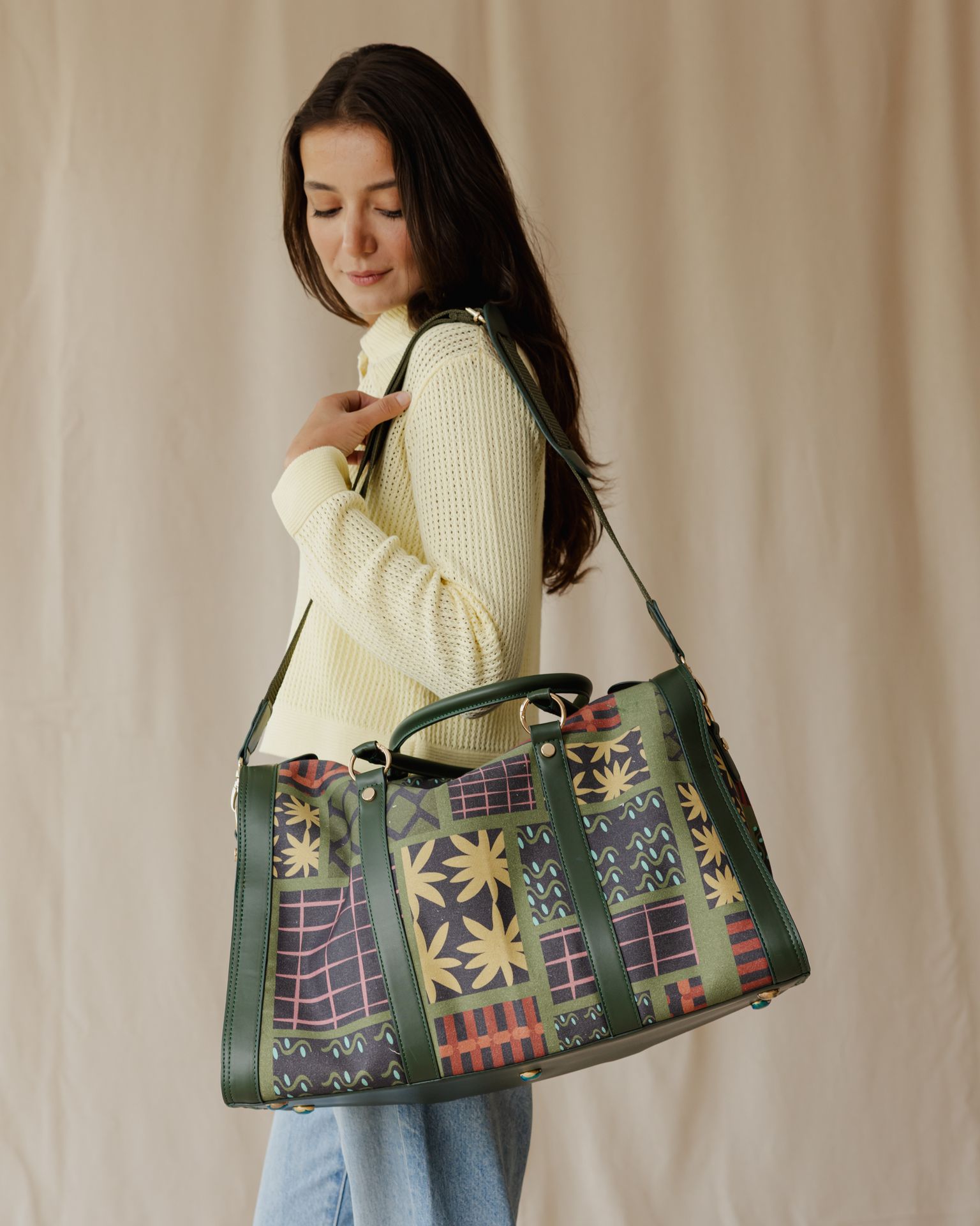 Viaggia con stile con questa borsa da viaggio in vera pelle. Il suo design elegante e i dettagli stampati unici aggiungono un tocco moderno a un look classico. Con tanto spazio all'interno, è perfetta per i viaggi del fine settimana o per le tue avventure quotidiane.