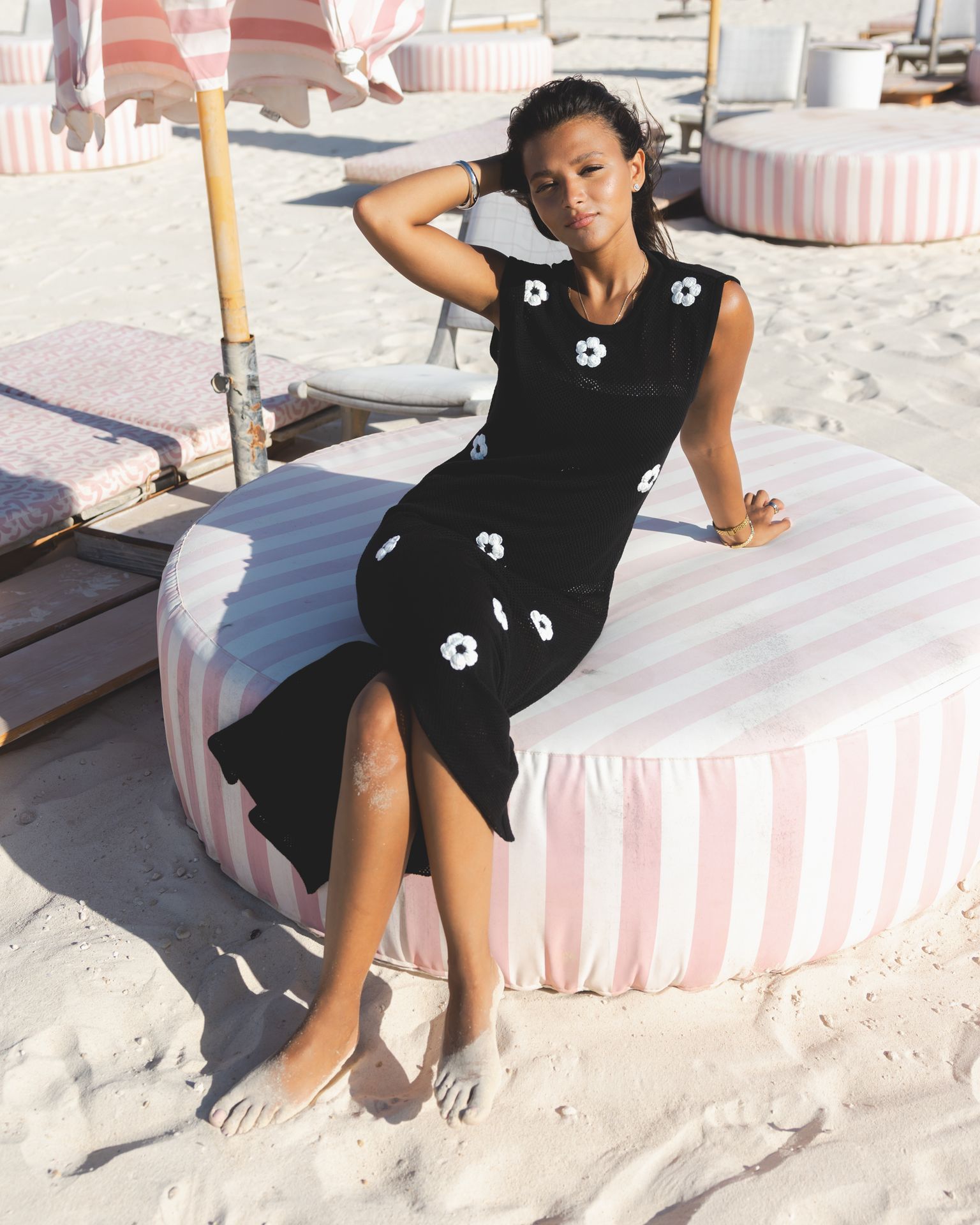 This breezy handmade open knit dress, adorned with playful floral appliqués, is perfect for layering over swimwear on a sunny day.