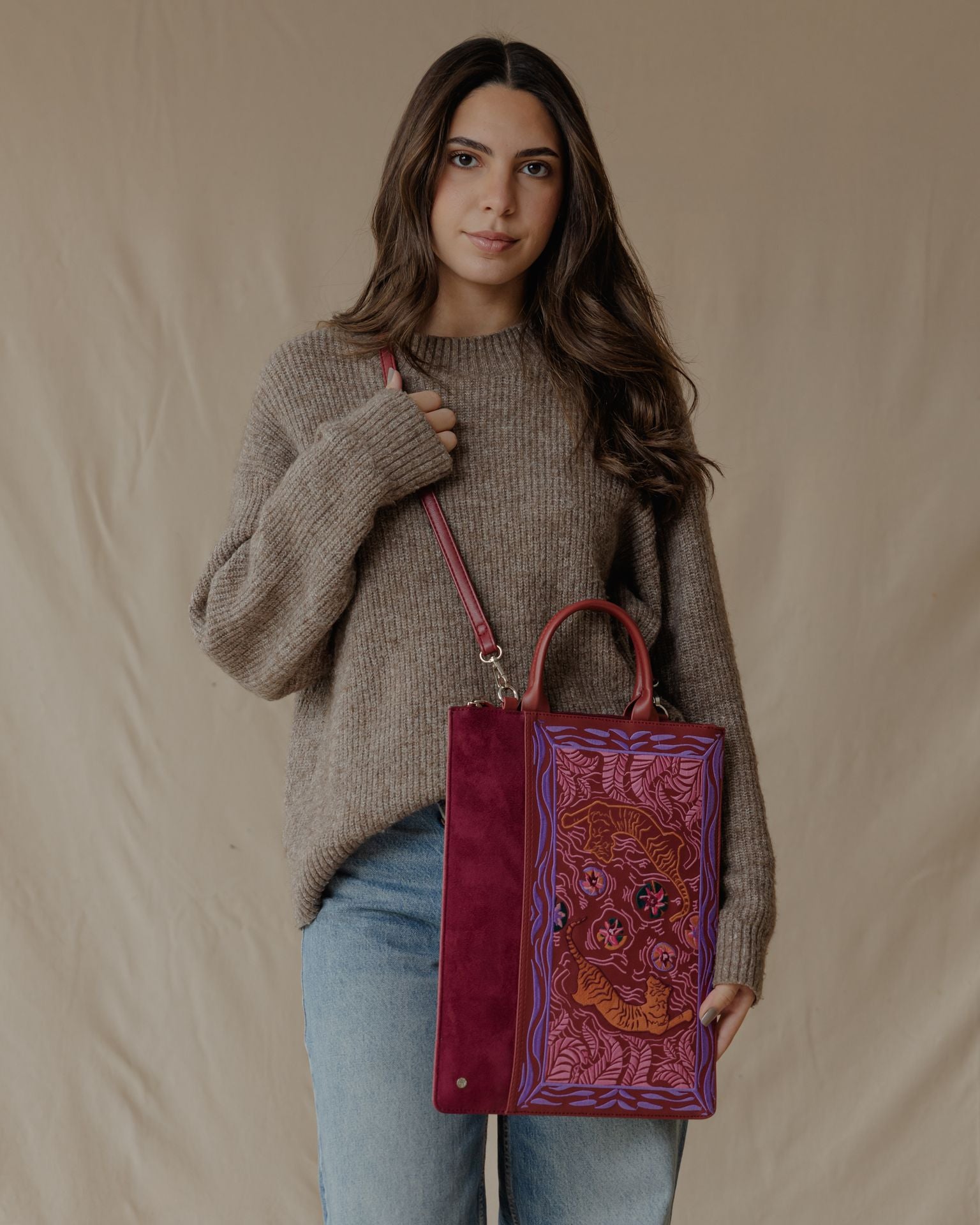 Tired of holding your laptop sleeve? This one you can carry from the small handle or wear it cross your body. A very slim design with embroidery pattern.