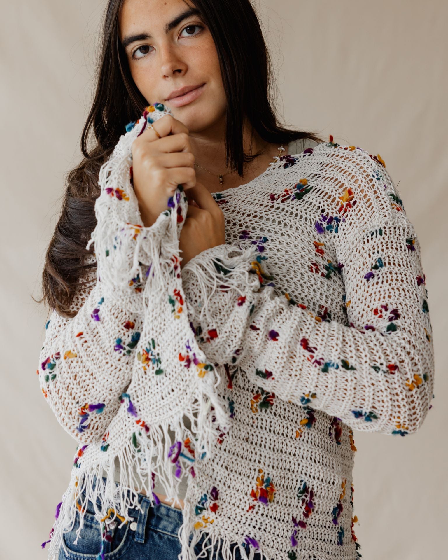 This cozy, multicolor striped cardigan adds a vibrant touch to any outfit, with fringe along the hem and sleeves that make it a fun layering piece for any casual look.