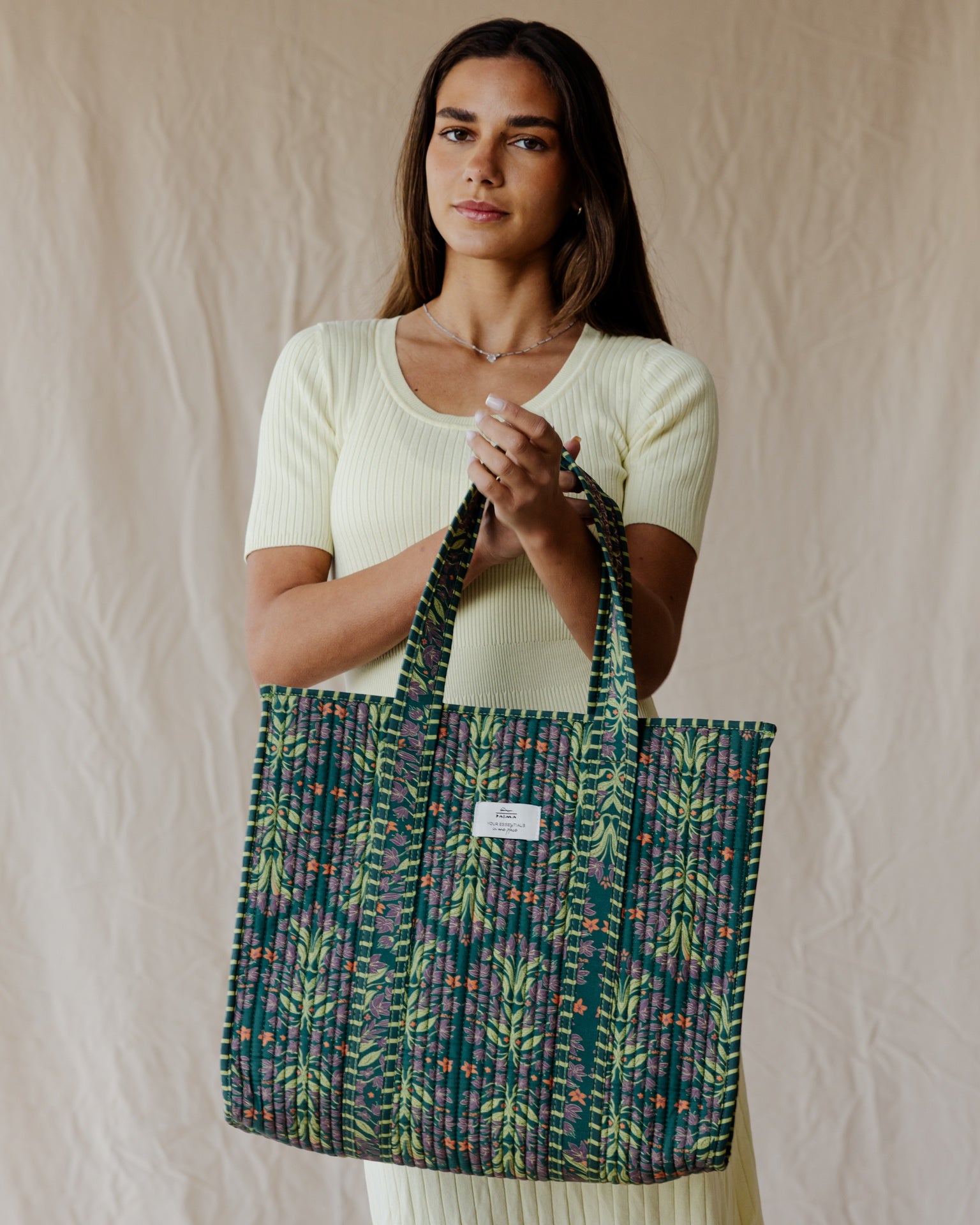 Our quilted, printed, and double-faced tote bag is the perfect accessory for anyone looking to add some style to their everyday look. With its unique design, this bag is perfect for carrying your daily essentials while adding a touch of personality to your outfit. The reversible feature allows you to wear it on both sides, making it a versatile accessory for any occasion.