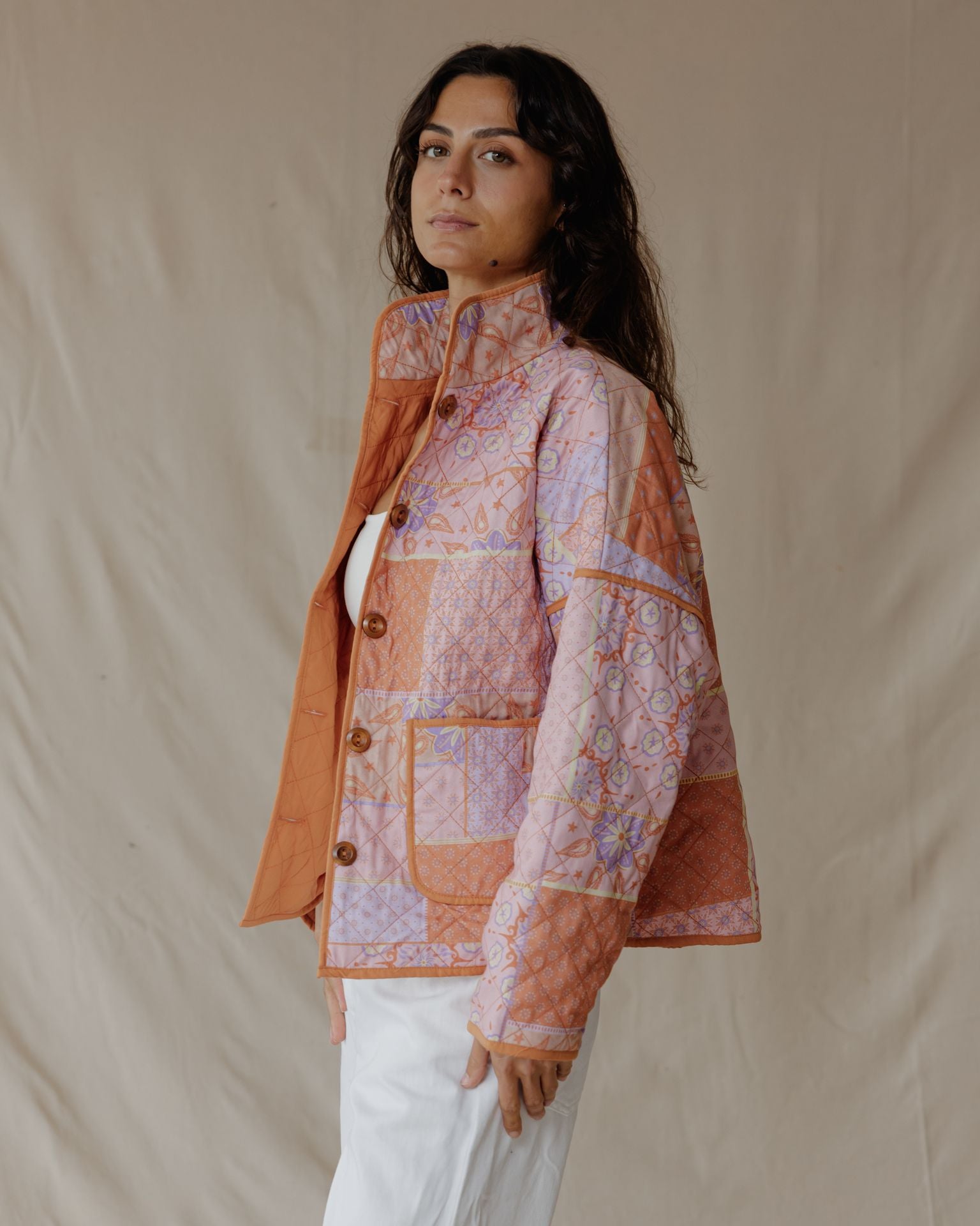 A quilted jacket designed in a relaxed fit, featuring a front button closure, contrast piping, and two front pockets. Ideal for layering and effortless everyday styling.