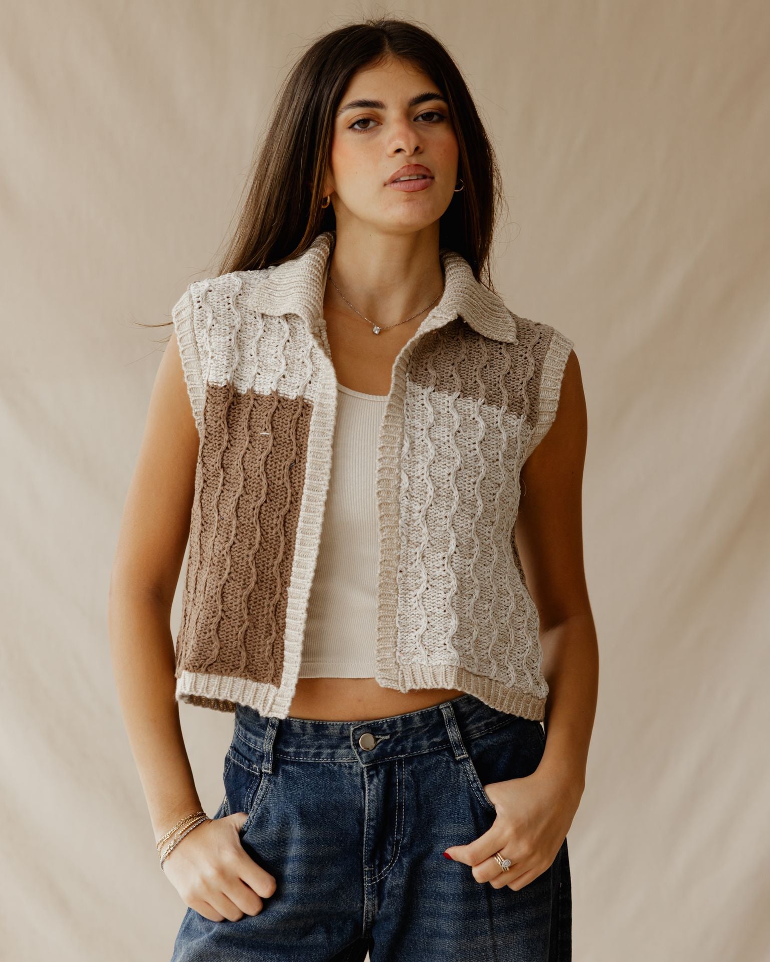 Inspired by traditional motifs, this knitted vest combines a striking colors with warm, earthy colors. Pair it with a simple tee or layer it over a shirt for a look that’s both timeless and contemporary.