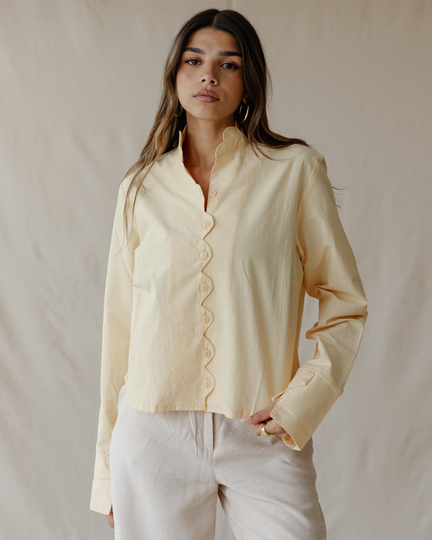 This unique long-sleeve shirt features a stand collar, a wavy button front, and wide cuffs that give it a chic look.