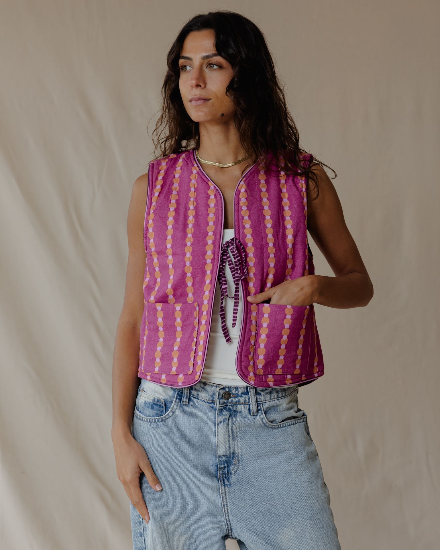 This double-faced cotton vest features a bold printed design on both sides, giving you two styling options in one. Soft and breathable, it offers comfort and versatility, making it ideal for layering or wearing as a standout piece in casual or dressed-up outfits.
