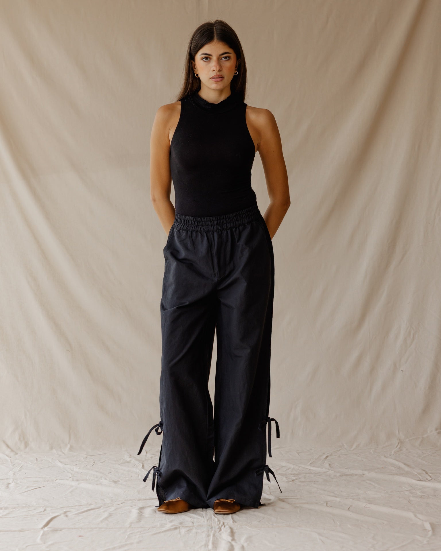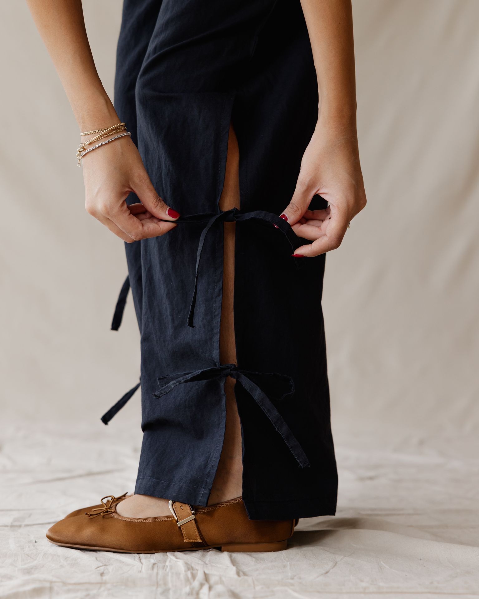 Forget your everyday trousers. These high-waisted, wide-leg pants feature unique, fashionable self-tie details down the side for a totally relaxed and chic look.