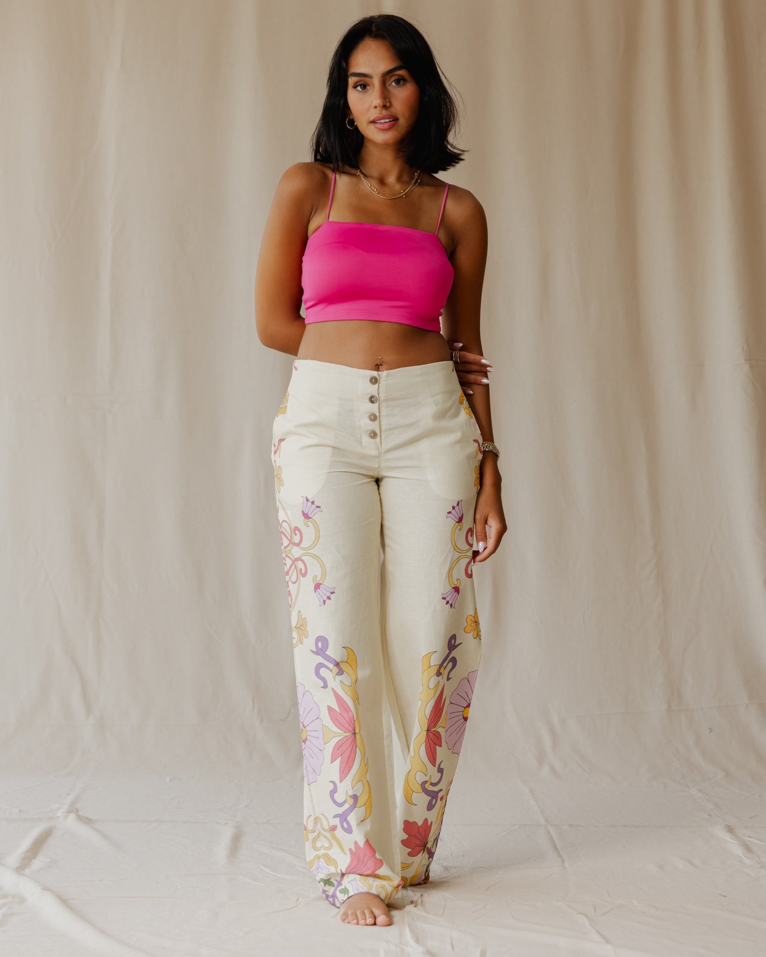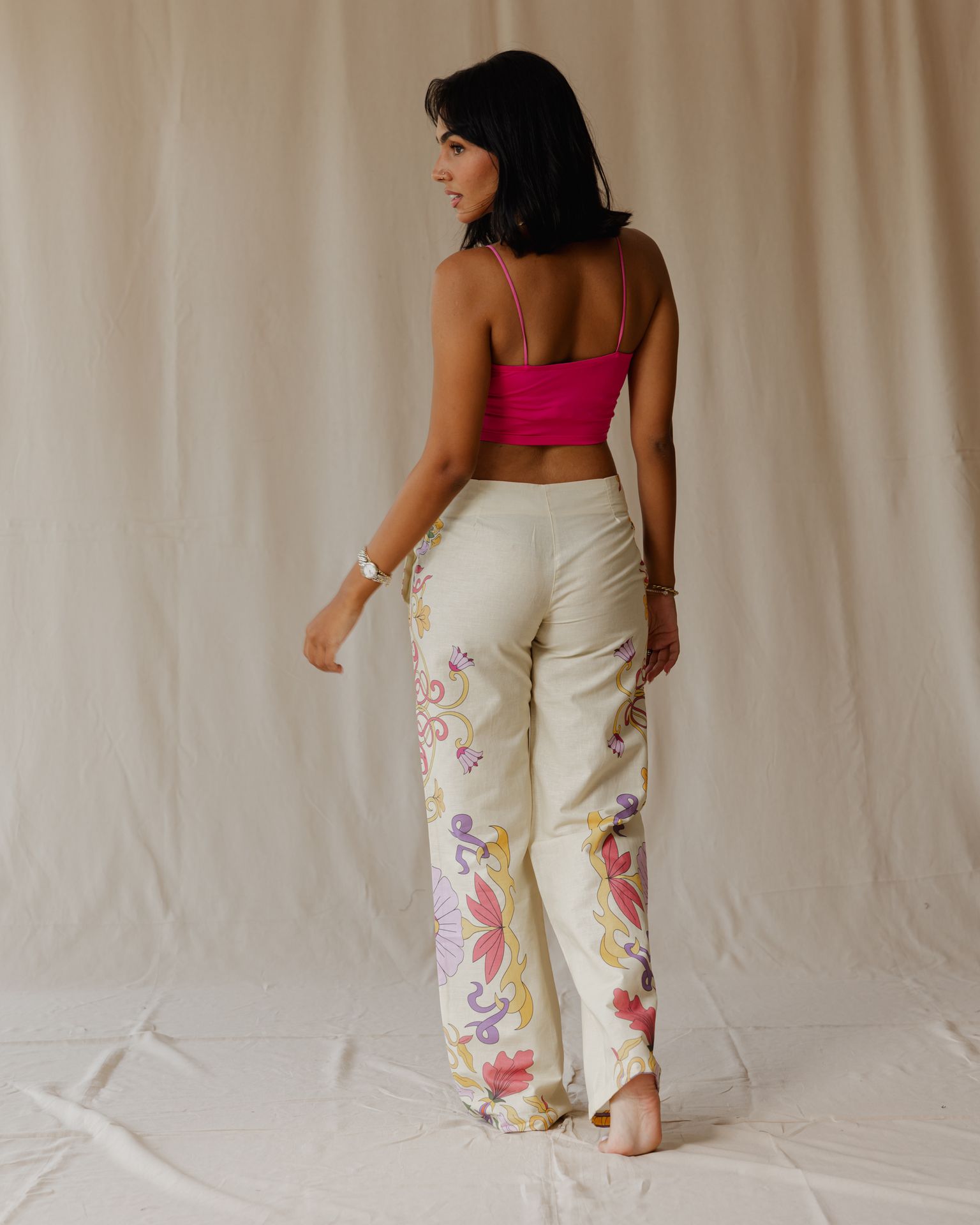 These wide-leg pants are all about easy style. They're super comfortable and have a fresh, modern floral print that makes them stand out. You can wear them with a simple top for a casual look or dress them up for a fun night out.