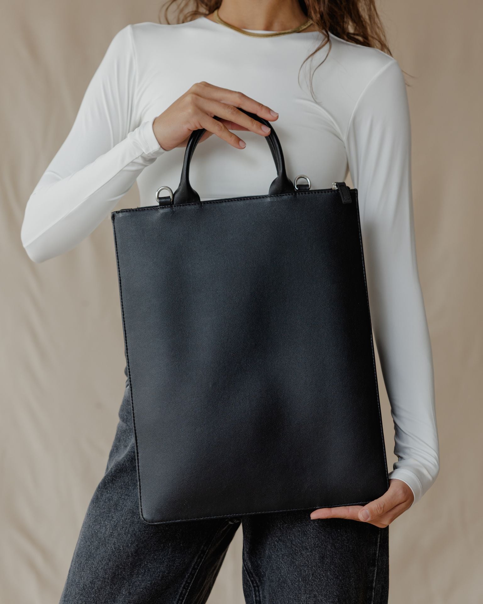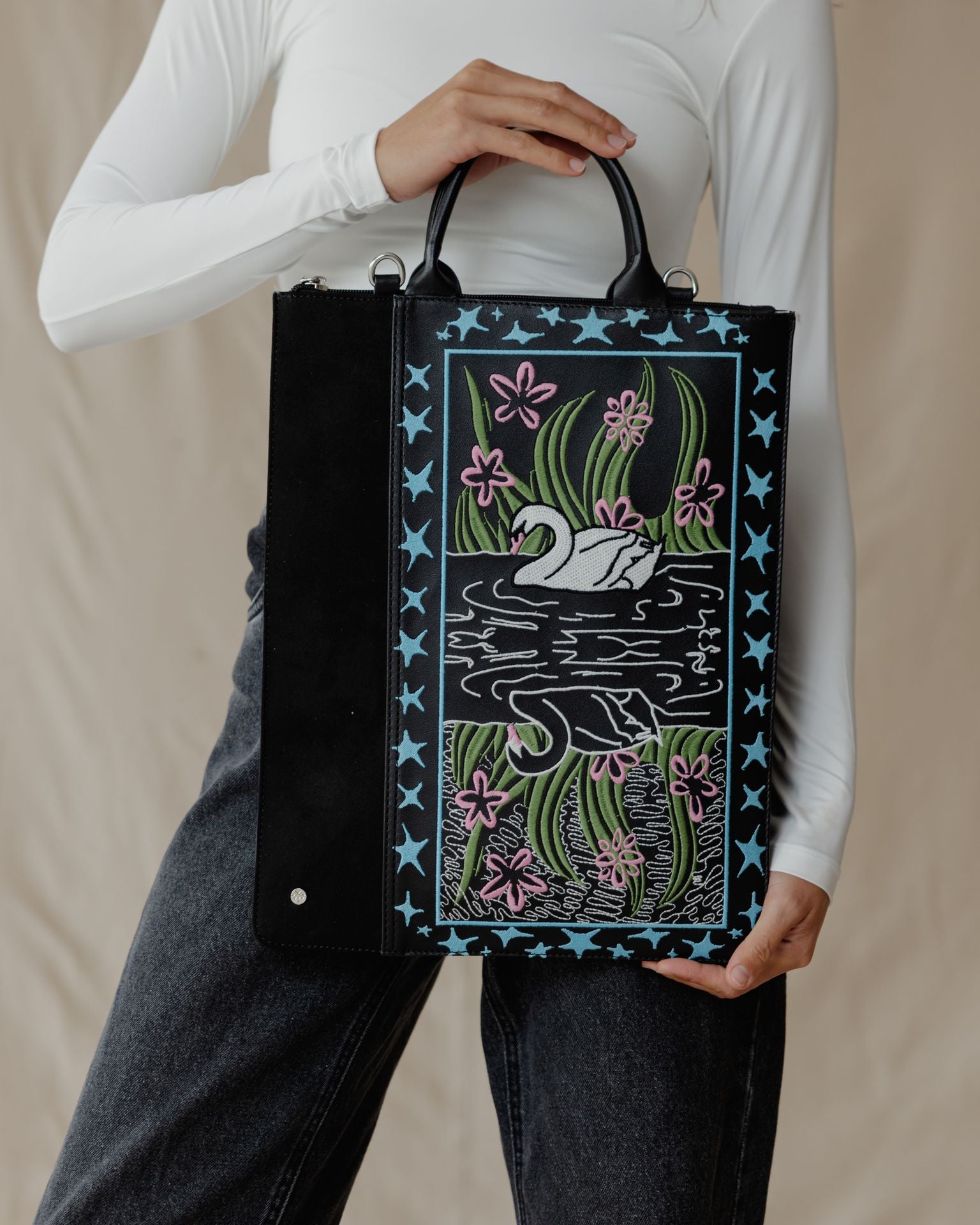 Tired of holding your laptop sleeve? This one you can carry from the small handle or wear it cross your body. A very slim design with embroidery pattern.