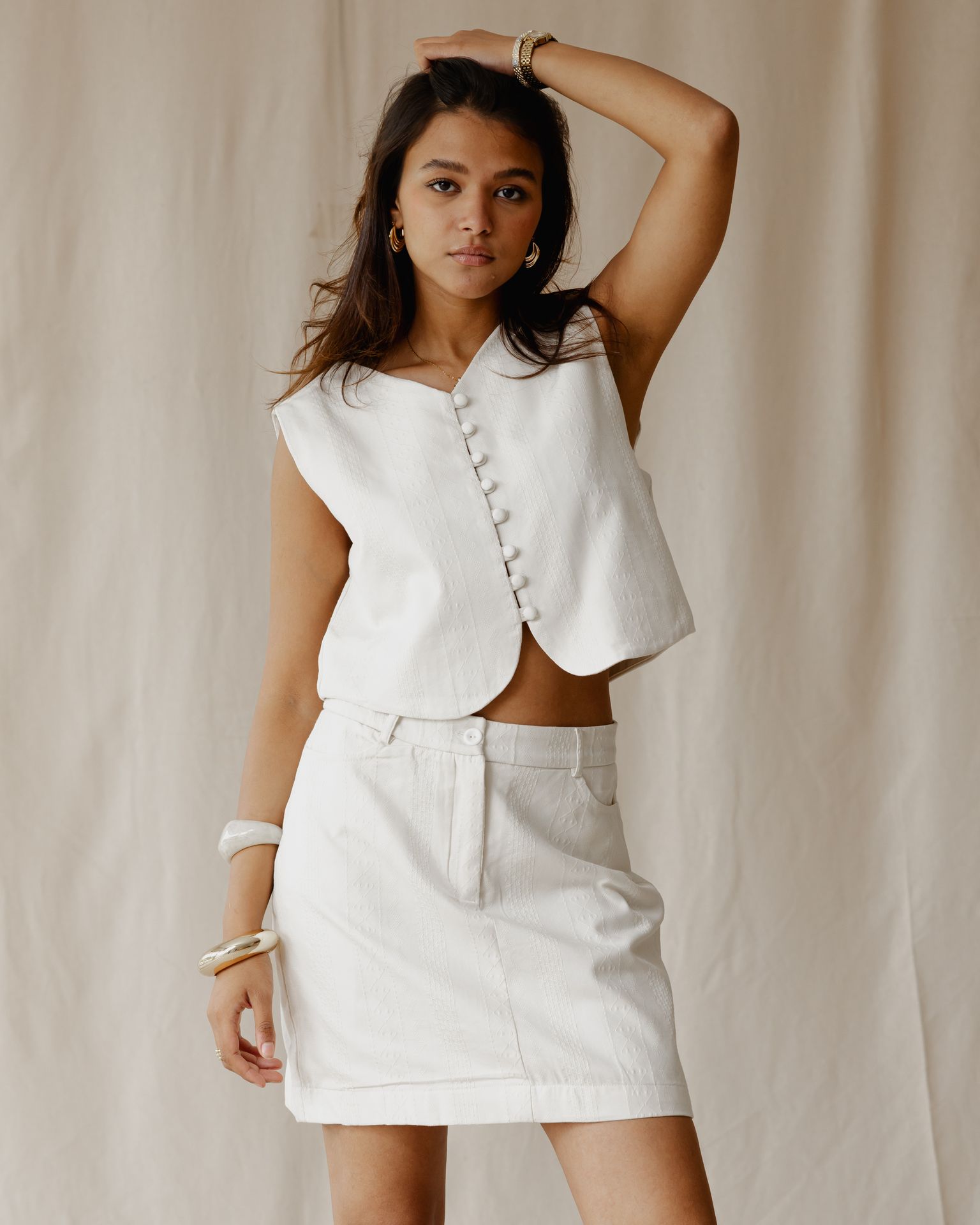 A breezy printed set made from soft viscose, featuring a tie-front vest and a buttoned skirt you can adjust to your perfect length — button it all the way down or leave a few open. Easy, light, and effortlessly put-together.